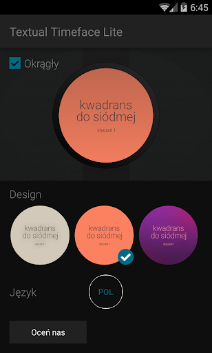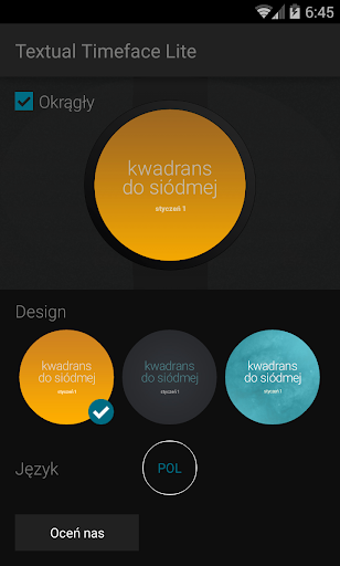 Zamiast tradycyjnych wskazówek i cyfr zegarka, ta twarz zegarka to tekstowa prezentacja czasu. Patrząc na zegarek widzisz „kwadrans do siódmej“ zamiast „6:45“.