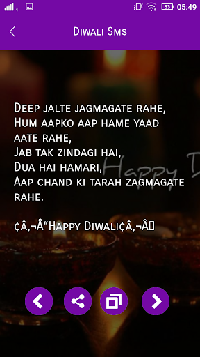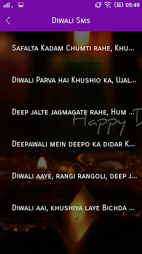 Very easy to send diwali messages to your near once. it's contains several nice diwali sms & wishes. Just choose a message by swapping on device, read it & share.