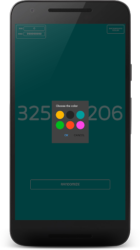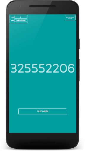 Dzięki tej aplikacji.Możesz łatwo generatorować losowy numer przez jeden dotyk w przycisku "Randomize".Lub, jeśli chcesz dostosować numer, możesz wprowadzić zasięg w górę w lewym górnym rogu i możesz zmienić "kolor tła".
