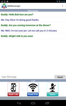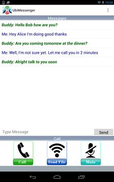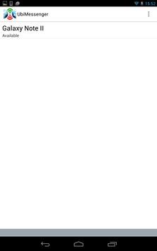 UbiMessenger is a simple to use text, voice and file sharing application, which works anywhere. A smart device running UbiMessenger can communicate by voice or instant messaging directly with another device within Wi-Fi range without the need for any network infrastructure. It is also capable of sharing files between peers. UbiMessenger searches for, discovers and lists all devices in your close proximity, which are UbiMessenger enabled and which are in range allowing you to select and talk to or text message any other device. The application is based on the Wi-Fi Direct functionalities provided by Google. The aim of the application is to allow people to connect and share information based on peer-to-peer local communication.