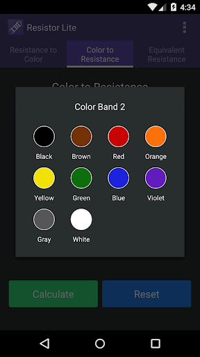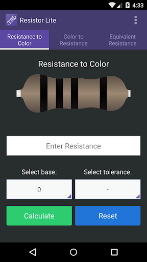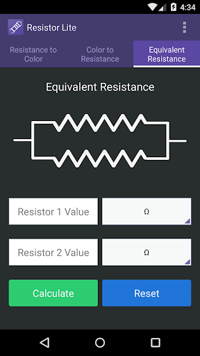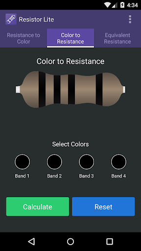 A resistor calculator application that converts from resistance value to color code, color code to resistor value, and parallel resistance value.