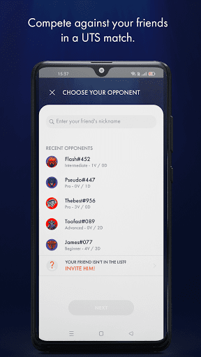 Weź swój smartfon i zorganizuj mecz UTS ze znajomymi, zapraszając je bezpośrednio za pomocą ich aliasu dla niezapomnianej gry! Możesz także wysłać zaproszenie bezpośrednio za pośrednictwem SMS lub nawet za pośrednictwem mediów społecznościowych, aby można je pobrać aplikację i dołączyć do Ciebie. Nie zapomnij o rozgrzewce, jest niezbędne, aby wygrać bitwę!