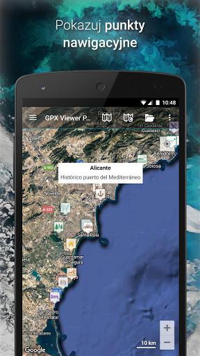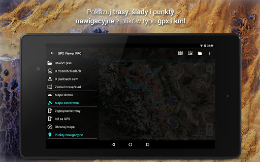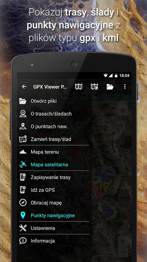 • wykreśla ścieżki, trasy i punkty nawigacyjne pobrane ze zbiorów typu gpx, kml, kmz i loc