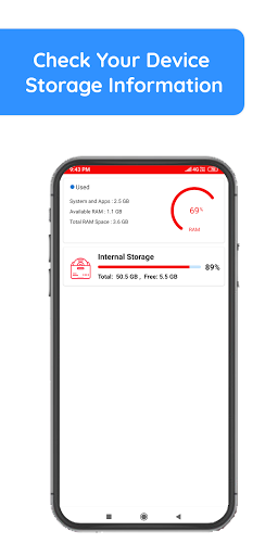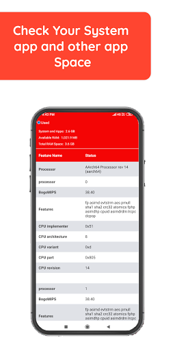 - Informacje o przechowywanie (jak urządzenie w całkowitej przestrzeni dostępnej i lewej przestrzeni. Całkowita pamięć RAM & User Ram & Dostępne RAM itp.)