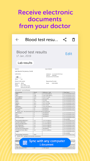 - Użyj aparatu w telefonie, aby uzyskać doskonale skanować dokumenty papierowe. Sync.md automatycznie uprawy, prostuje i zapisuje go w rekord zdrowia