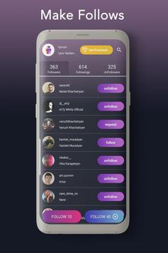 With this application you can easily grow your instagram account followers and save your time. No need to scroll page down and click for every follow.You can open every user followers or followings and make up to 160 follows with one click in those lists.