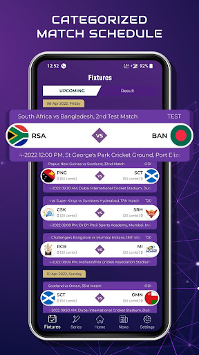 Zapewniamy skategoryzowane harmonogramy meczów dla meczów International, ODI, Test, T20, Lagues. Możesz znaleźć pełne informacje o zakończonych meczach. Będziesz miał okazję zobaczyć harmonogramy meczów, filmy z granymi meczami, wyłączami i opiniami.