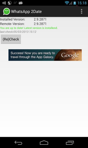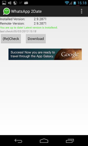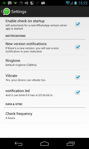 You are curious what new features the new WhatsApp update will bring?New emoticons New functionality? New layout?Why waiting so long still there is a new version in the playstore?This app is looking for official pre-releases, that are released before a new WhatsApp release hits the playstore.If you want this app checks periodic if there is a new pre-release and notifies you. If you want it can install the new relase.Yes the playstore-Version can become higher than the Server-Version. In this case this app notifies you that there is a new version and the download button leads to the official playstore-entry of WhatsApp, so you can update as usual.These pre-releases of WhatsApp contain additional payment methods, like PayPal. For those without a credit-card it's a cool thing to have this option.Furthermore the whole design of WhatsApp is made new with the Holo-Design, what looks more neatly arranged.Stay bleeding edge and up2date :-).To be able to install the prereleases you have to activate Allow app installs from 'unknown sources' option.Refer to: http://www.androidcentral.com/allow-app-installs-unknown-sourcesplease keep in mind, it's still betaplease keep also in mind, that im not responsible for the content or problems that may come with updatesUsed Permissions:CONTROL VIBRATION: to vibrate on notificationFULL NETWORK ACCESS: Used to check if there is inet available and get some data from the inet (refresh server-version-info and download)MODIFY OR DELETE THE CONTENTS OF YOUR USB STORAGE MODIFY OR DELETE THE CONTENTS OF YOUR SD CARD:The new WhatsApp-Version is temp. stored in the default download-directory