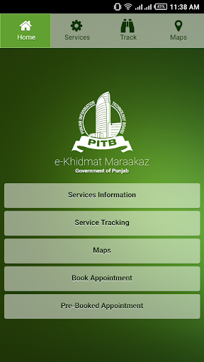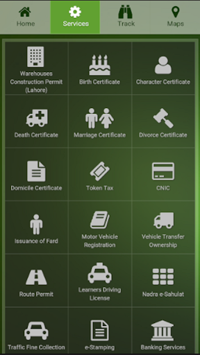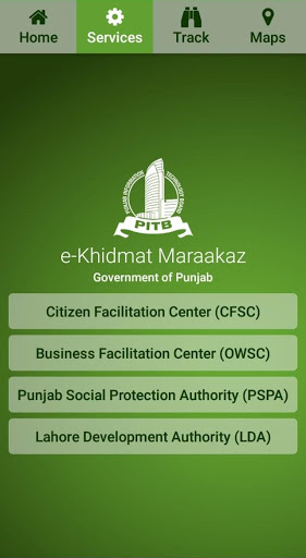E-Khidmat Maraakaz Concepts Aby zintegrować siedemnaście usług rządowych pod jednym dachem dla obywateli, łagodzenia obywateli wobec rządowej międzyfazowej.Usługi te obejmują emisję zezwolenie na budowę magazynów (Lahore), certyfikat urodzeń, certyfikat charakteru, certyfikat śmierci, świadectwo małżeństwa, certyfikat rozwodu, certyfikat zamieszkania, podatek żetonowy, ceric, wydawanie fard, rejestrację pojazdów silnikowych, własność transferu pojazdów, zezwolenie na trasę,Pozwolenia na prowadzenie uczniów, kolekcja Nadra e-Sahulat i Drogi.