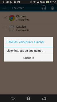 The application enables you to launch applications via voice commands. To do add a voice command for a new application, open and start the GAMBAS middleware and select the voiceprint launcher from the applications menu. Press the add button at the top of the screen and pick an application installed on your device. Then select the application, press the train button and say the application name to record a voiceprint. You can repeat the process to add multiple voiceprints or applications. Once you are done, you can launch an application by clicking the start button and saying the name again. In order to get instant access to the launcher, you can add the voiceprint launcher widget to your homescreen.