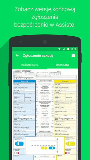 Proces jest taki sam jak w przypadku formularza europejskiego zgłoszenia wypadku, ale wykonuje się go znacznie szybciej i łatwiej. Assisto pozwala poszerzyć kontekst poprzez takie funkcje jak współrzędne GPS, zdjęcia itp. Gdy wniosek ubezpieczeniowy zostanie wypełniony, otrzymasz potwierdzenie SMS i e-mail z wersją PDF europejskiego zgłoszenia wypadku.
