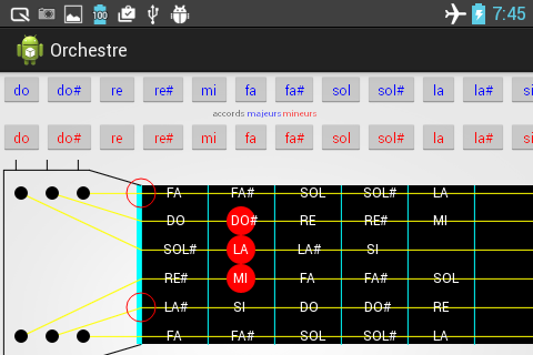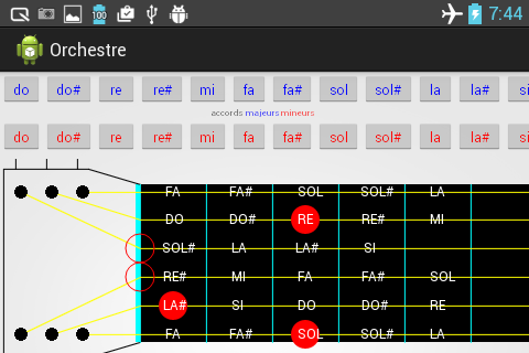 Vous pouvez avec cette application jouer des notes directement sur le manche de la guitare ou faire des clics sur des accords majeurs et mineurs. Cette application avec pub est un peu instable sur des téléphones de performance un peu limité. Téléchargez plutôt mes autres applications.