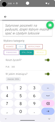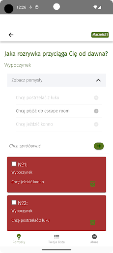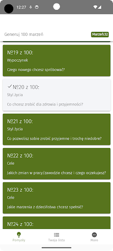 Wiem, jak trudno jest napisać 100 marzeń z głowy, więc stworzyłem tę aplikację. Znajdziesz w nim 100 pytań z różnych dziedzin życia. Spróbuj przemyśleć pytanie i napisz swoje pragnienie. Aby uzyskać inspirację, możesz kliknąć przycisk „Zobacz pomysły”.