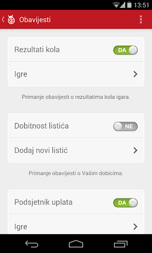• nudi mogućnost postavljanja podsjetnika za uplatu i primanje obavijesti o rezultatima i dobicima