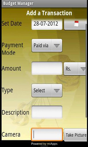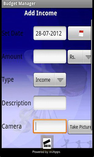 The Fantastic tool to manage your Income amp; Expenses and keep track of your Day to Day expenditures along with the income. Will help the every user to analyze his Income amp; Expenses which will help to categorize the Expenses and plan the same with the available periodic Income.miApps Budget Manager is a personal finance management software loaded with features designed to help you manage your money accurately and efficiently. Budget management is made easy with the help of userdefined income and expense budget categories, budget projections, and budget versus actual comparison reports. calculation of net income over any given period of time, two distinct methods for managing your budget.With budget projections, you can now tell exactly when and how much you are planning to earn or spend on any budget category. This is very similar to using the old envelope budget system. Budget Manager contains the useful menus such asAdd Expense , Add Income, View Expense, View Income,Analysis and Calculator. Add Expense menu allows you to add your expenses including date, mode, amount, type and description. Additionally you can use your device camera at running application to take picture. Add Income also have same fields as Add Expenses that stores your income with useful information Analysis shows the details of income whereas Expense analysis shows the details of expenditure.Calculator provides the additional functionality to the application to make calculations easy.With so many personal finance software products on the market today, why have we decided to create yet another one. The answer is simple; although it is true that the number of personal finance software products on the market today may appear excessive, none is perfect and each has its own strengths and weaknesses. Some provide enough features to make you dizzy just by looking at their user interface. Others have a very clean user interface, but are missing some of the most basic features that any one needs to properly manage their personal finances.After trying the vast majority of the most popular personal finance software products, we have concluded that it was almost impossible to find the one with what we believe to be the right balance between simplicity, features and reliability. Take time to try this, you too will agree that Budget Manager is one of the best personal finance software products on the market today. The user interface in Budget Manager is unique. With its tree view structure that allows you to easily browse through its major elements accounts, budget categories , finding the information that you need in Budget Manager is intuitive, quick and easy. In the hitech world in which we live today, it is hard to imagine anyone planning a budget and keeping track of their expenses without the help of a personal finance software. However, the reality is even much worse. Most people know how much they earn but hardly have any idea how much they spend. What a user can do The first step towards debt elimination and financial freedom is knowing where your money comes from and where it goes. The next step is to setup a personal or family budget and stick to it. Fortunately, for those who are serious about controlling their budget, using a personal finance software like Budget Manager can make all the difference in tackling this daunting task Once you know where your money goes, it is easy to see where you overspend and where you can save. Budget manager allows you to setup a budget plan and see how well you do in following it with the help of Actual versus Budget comparison reportsManagingthe Money When speaking about personal money and family budget, we need not only quot;something which can countquot; but also something handy, flexible and easily understandable. It39;s Budget Manager, the software which meets the highest standards of personal finance solution.