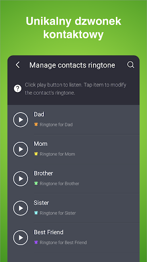 • Czytaj kontakty - aplikacja korzysta tylko z uprawnień, aby pomóc Ci przypisać unikalny dzwonek do kontaktu;