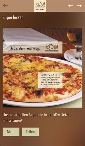 Die kleineDorfwirtschaft oder kurz - die kDw. Wir möchten unseren Gästen Gutes bieten, aus der heimischen Region. Auf unserer Karte finden Sie immer wieder wechselnde Gerichte. Klein, fein, lecker und überschaubar! Mit der kDw App erhalten Sie jetzt aktuelle Neuigkeiten zu unseren Speisen, Getränken, Veranstaltungen und Öffnungszeiten. Oder nehmen mit uns Kontakt für Ihre Reservierung auf.