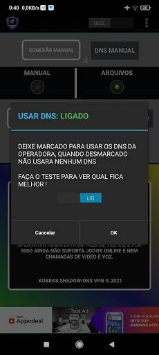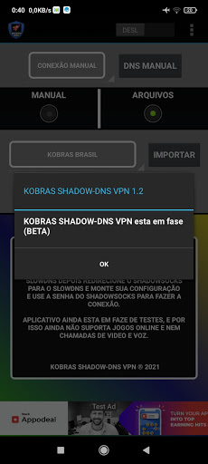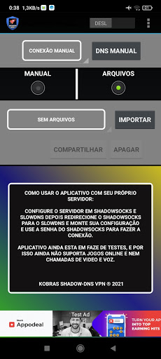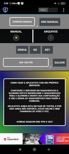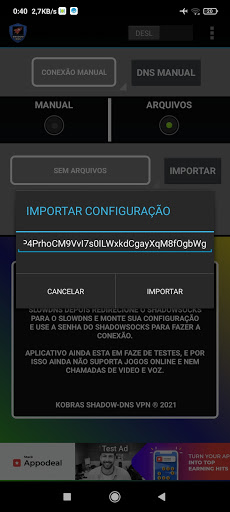 Aplicativo de conexão VPN. Usa conexão SHADOWSOCKS DNS. Simples de usar.