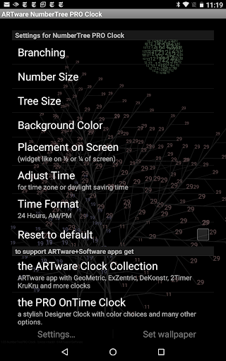 The Artware Nottree Pro Clock to tapeta na żywo (LWP).Zegar Numbertree wyświetla godziny, minuty i sekundy dołączone jako liście do drzewa. Data, miesiąc i dzień stają się słońcem w krajobrazie numeru.Ten zegar jest tak inny, jak od zegarek szwajcarski.Wersja PRO ma większy zakres do parametrów do regulacji i obejmuje ustawienie 24/12 godziny.