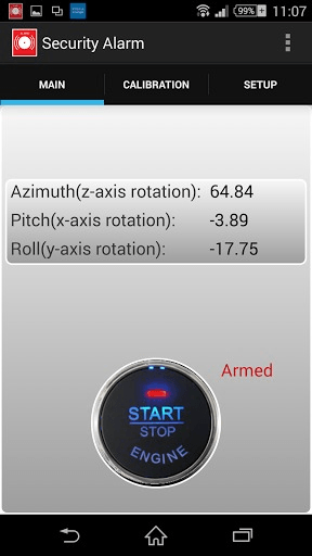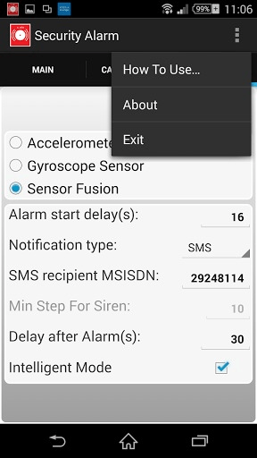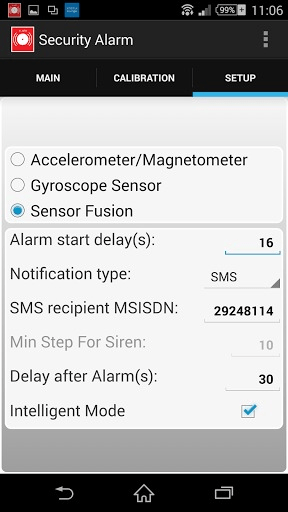 Simple Mobile Security Alarm If you have a need to control what or their property, then this app is for you! Now any modern smartphone has a number of positioning sensors. This can be used for notification of changes to this provision. Three modes of notification: Beep, Siren and SMS. Beep - for the protection of stationary objects. For example any apparatus or door opening. Notification occurs immediately without delay when changing the device position (or on second actuation). When triggered again, the beep repeated immediately. Siren - for the object protection after that, when make a few steps(pedometer). For example bags at the airport. The siren is activated only after that, when attacker made a few steps with your bag. Siren is continuous for a long time. Volume is set to MAX. Can only be disabled by entering the PIN-code. SMS - for example in the protection of the car, in the presence of a second gadget. (In recent years, the market and at the hands of a huge number of old gadgets on Android OS 2.2 and above). In this case, the SMS is sent after the delay set by the user in Tab "Settings". SMS will be sent periodically as a sensor is triggered at intervals of one minute. In the body of the message parameters are passed along the axes deviations from the values ​​of which it is possible to assess the degree and direction of the impact on the protected object. The application has the ability to calibrate the sensitivity of the axes. This is necessary to ignore the background noises of device sensors and noises, depending on the operational conditions of the protected object. Sensor indications below the values ​​of the parameters of the background noise will be ignored. You can choose to use a combination of sensors. The recommended combination is "Sensor Fusion" for filtering and characteristics smoothing. Intelligent mode is needed to prevent false positives. In this mode, the signal for activating set only after two events occurs in the time interval of one minute. Delay within events must be at least two seconds. Mode is recommended, as many gadgets spontaneously at times give peak values ​​of sensors without visible influence. In the application it is possible to buy some options for a nominal fee (In-app Billing). * You can disable the display of advertising messages. * You can enable mode without time restriction in "armed mode". Warning! Without purchase this option, protection regime can be set off-mode automatically after 2-6 hours! Remark! * Functionality may be limited by the technical capabilities of your device. * The number of false positives does not depend on the quality of the application, but only on the quality of gadget sensors.