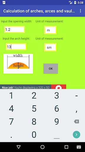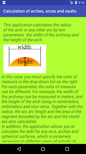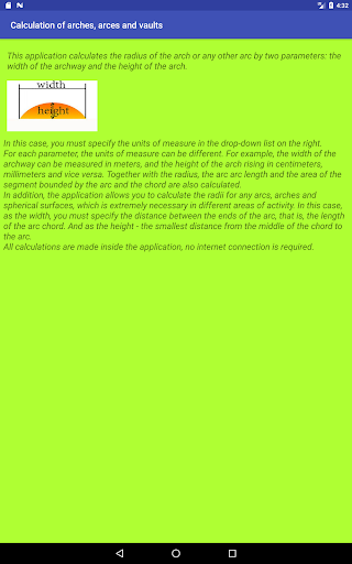 In addition, the application allows you to calculate the radii for any arcs, arches and spherical surfaces, which is extremely necessary in different areas of activity. In this case, as the width, you must specify the distance between the ends of the arc, that is, the length of the arc chord. And as the height - the smallest distance from the middle of the chord to the arc.
