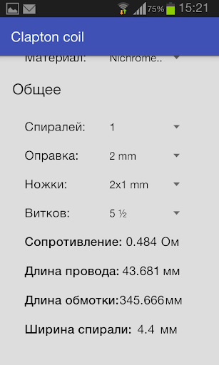 Новый простой инструмент для рассчета нагревательных элементов, который будет постоянно пополняться новыми функциями. Мы хотим посчитать всё, что только возможно и уместить это в одном простом приложении. Скоро появятся такие виды спиралей, как alien coil,stove top coil, а так же возможность рассчета нескольких разных коилов в параллельном соединении.