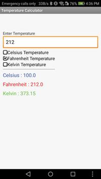 Features: * Calculate temperature from Celsius to Kelvin; from Kelvin to Celsius * Calculate temperature from Celsius to Fahrenheit ; from Fahrenheit to Celsius * Calculate temperature from Fahrenheit to Kelvin; from Kelvin to Fahrenheit