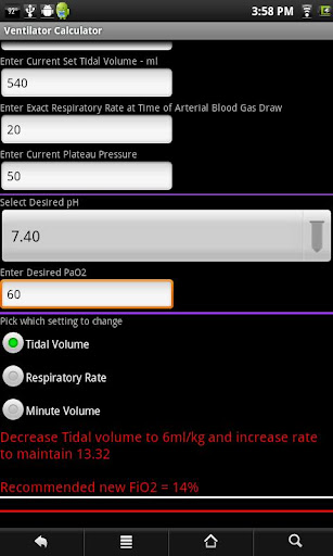 Część korekcji kalkulatora wentylatora zapewni sugestie dotyczące poprawek na podstawie aktualnego stanu pacjenta. Jeśli zatem stan pacjenta stale się pogorszył, a następnie kalkulator wentylatora pomoże, ale nie zapewni długoterminowych odpowiedzi na potrzeby pogorszenia pacjenta. Jednak w tym momencie będzie poprawny dla potrzeb pacjenta, pomagając ci pozostać z szybkim zmieniającym się potrzebami pacjenta. W takim przypadku będą wymagane, konieczne będą seryjne gazeny krwi, a poprawki podjęte do ustabilizowania stanu pacjenta.