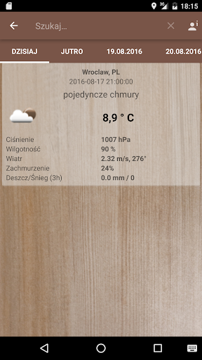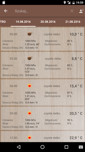 Od wersji 2.0 możesz także sprawdzić prognozę pogody dla aktualnej lokalizacji (jeśli GPS jest włączony) lub znaleźć informacje dotyczące pogody dla dowolnego miasta. Potrzebne jest tylko połączenie z Internetem. Pięciodniowa prognoza jest dostępna dla dowolnej lokalizacji lub miasta. Zawarte są w niej dokładne informacje dla 3-godzinnych przedziałów.