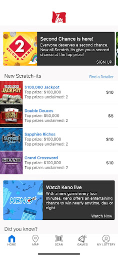 • Zakup Bilety Keno i / lub Advance Dysponuje na Loterii Loterii Oregon i graj z domu za pośrednictwem aplikacji mobilnej. Sprawdź dokładnie bilet, aby sprawdzić, czy byłeś zwycięzcą, szybko przełączając się do narzędzia do skanowania Loterii Oregon.