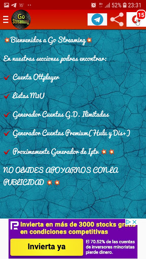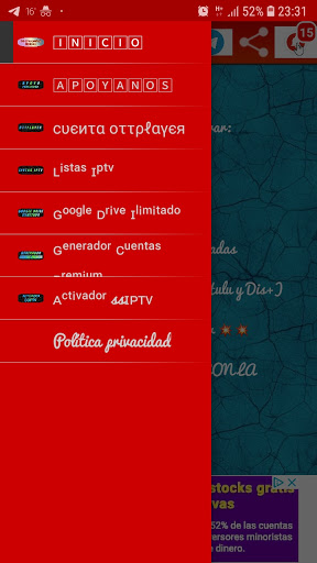 DISFRUTA DE NUESTRA OTTPLAYER ACTUALIZADA TODOS LOS DIAS CON 10 OPCIONES DE CANALES LATINOS , 5 OPCIONES DE CANALES MOVISTAR ESPAÑA , LOS MEJORES EVENTOS DEPORTIVOS, GENERADOR DE CUENTAS PREMIUM, LISTAS IPTV ACTUALIZADAS TODOS LOS DIAS Y MUCHO MAS.