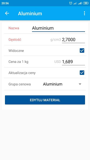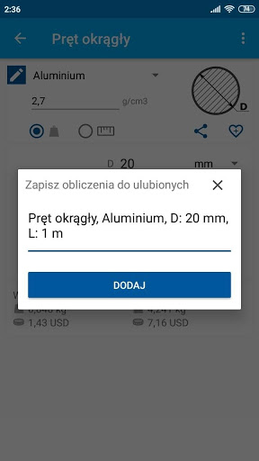 Aplikacja oblicza cenę przedmiotu (np. rury) na podstawie cen materiałów