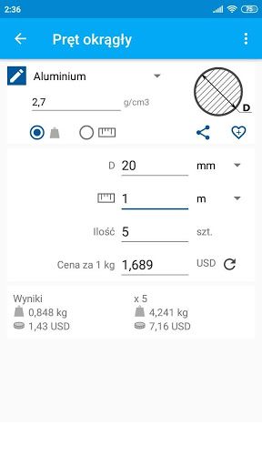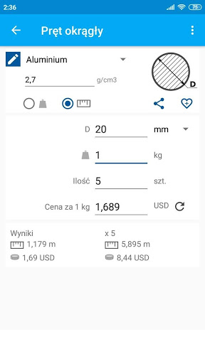 Oblicza wagę/długość prętów, rur i kształtowników (profili) na podstawie wymiarów podanych przez