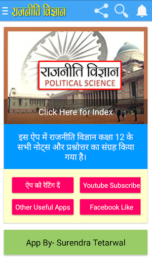 App contains solutions of all chapters of NCERT Political Science for class 12. It contains some sample questions papers and chapter wise question answers also. This app has a very simple user interface.