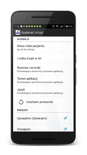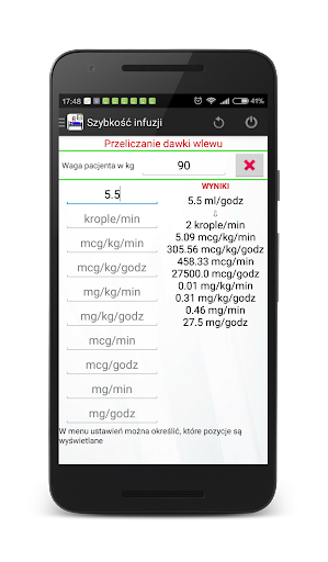 Program pozwala na obliczenie szybkości infuzji leków. Zamiana z ml/godz na mg/min, mg/kg(lb)/min, mg/kg(lb)/godz, mg/godz, mcg/kg(lb)/min, mcg/kg(lb)/godz, mcg/godz jest szybka, prosta I wymaga tylko kilku klikniec. W ustawieniach mozesz wybrac mase ciala w kilogramach lub lbs (w UK)