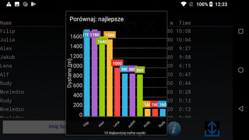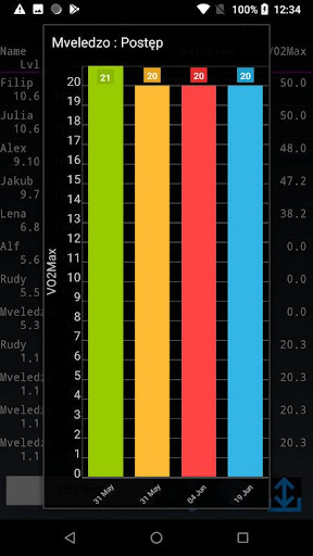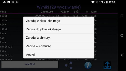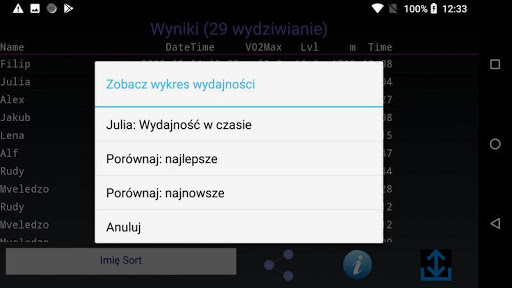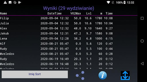 - Sortuj wyniki. Według nazwy, VO2Max lub daty