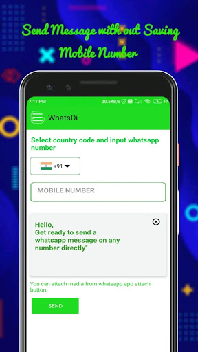 Ta aplikacja nie jest związana, ani zatwierdzona przez WhatsApp, który jest zarejestrowanym znakiem towarowym WhatsApp Inc. Wyślij wiadomość bez Saving Contact wykorzystuje oficjalne API WhatsApp do wysyłania wiadomości do każdego kontaktu, który jest zarejestrowany w aplikacji.