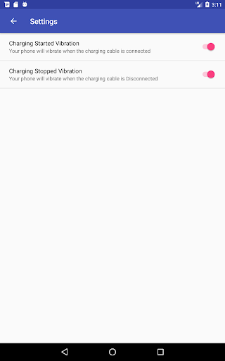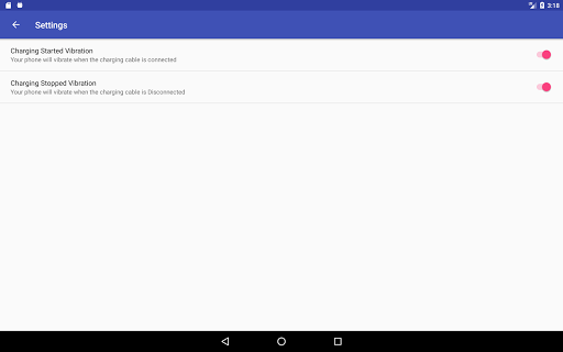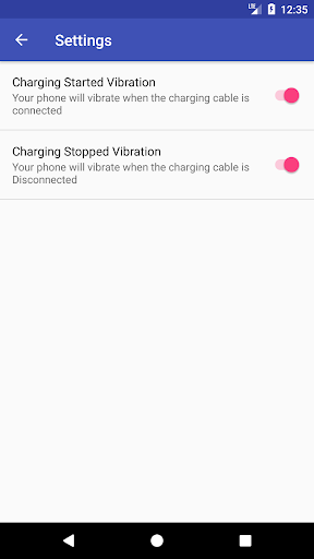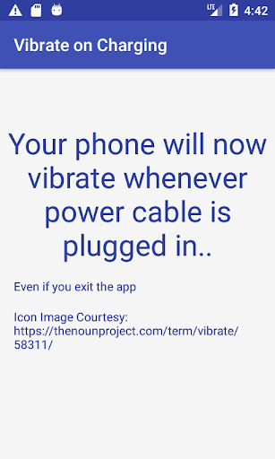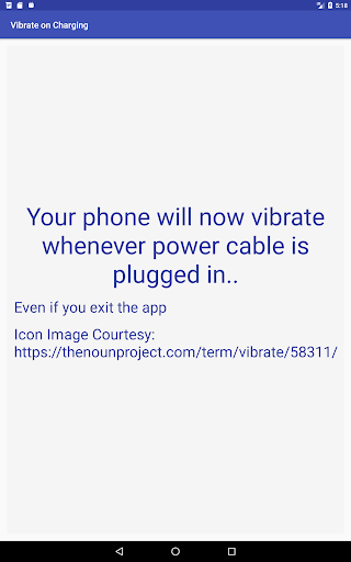 Aplikacja wibruje podczas uruchamiania ładowania.Przydatne dla kogoś, kto używa pokrywy mobilnej i nie widać światła powiadomienia o rozpoczęciu ładowania.Lub dla osób, które migrowali z iPhone'a i zwykłymi telefonem wibracyjnym, gdy USB jest podłączony do mocy.