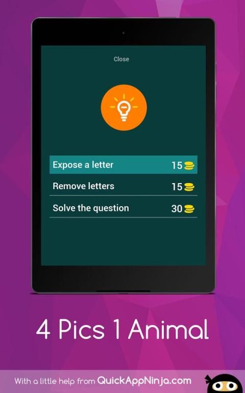 4 Pics 1 Animal is a kind of guess the picture quiz. You must guess the name of the 4 Pics that showing in your phone's screen.