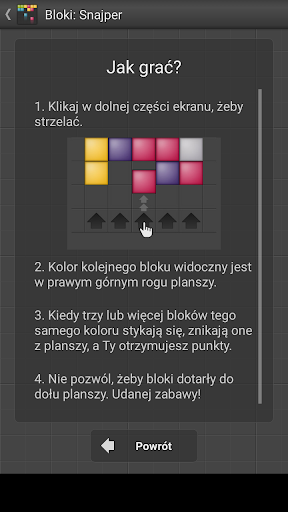 Strzelasz używając kolorowych bloków. Kiedy przynajmniej trzy bloki tego samego koloru stykają się, zostają one usunięte z tablicy, a Ty otrzymujesz punkty. Mała podpowiedź: celuj w bloki takiego samego koloru, co Twój pocisk.