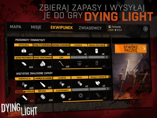Komponenty do broni, zapasy i ekwipunek znaleziony przez zwiadowców możesz wysłać z aplikacji do swojej kopii gry Dying Light. PAMIĘTAJ: Aby przesłać przedmioty do Dying Light (gry dostępnej na PC i konsolach nowej generacji), należy stworzyć konto z poziomu aplikacji Dying Light Companion.
