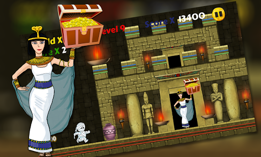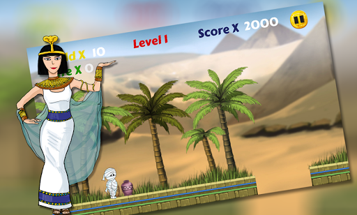 Egipt Mummy Run to urocza i zabawna mała mumia biegna i skokowa gra przygodowa.Pomóż ślicznej małej egipskiej mumii, aby dotrzeć do złotego skarbu Cleopatry.Zbierz jak najwięcej złota w drodze do złota skarbu.Poluj na skarb jak najszybciej skakać i dotknij, aby dwukrotnie skakać i uciec od pułapek.Biegnij z małą mumą i pomóż nabrać skarbów.