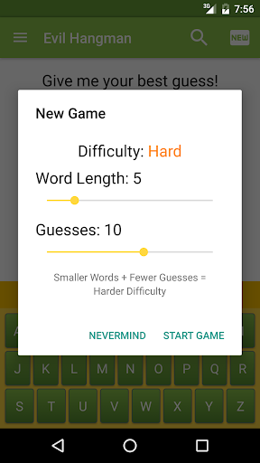 Evil Hangman is just like your ordinary game of hangman but with a twist: You can't win. OKAY, maybe that's an exaggeration. You CAN win, but even with more guesses than half the letters in the alphabet you will still struggle.