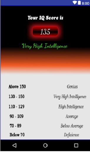 Ta aplikacja jest dowcipem i nie dostarcza żadnych prawdziwych IQ.Tylko dla zabawy, pozwoli Ci wiedzieć, jak bardzo jesteś mądry, po prostu trzymając palec po lokalizacji odcisków palców.Trzymaj palec, poczekaj kilka sekund i podziwiaj swój wynik!