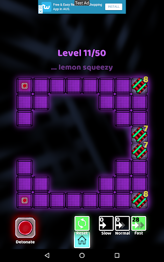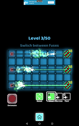 Fuse is a logical puzzle game. The first few levels help you understand the rules and logic of the game. In each level, you are given a number of bombs and detonators placed around the board. Each bomb has a countdown timer showing how much time you have to explode the bomb. Connect the bombs to a detonator using fuses (slow, normal, fast). There are different types of fuses that burn at different speeds: slow, normal and fast. Once you have connect all bombs to a detonator, press the detonate button to run the explosion simulation. If all of the bombs explode before their countdown reaches zero, you win and can progress to the next level.