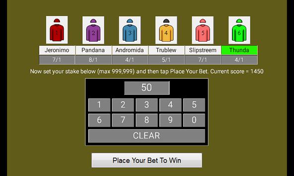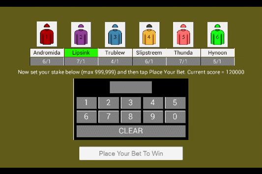 Bet in the thousands like the greedy rich but never lose a penny. Bets are in points not pounds so you can freely bet big on your favourite horse over 1200 metres and 8 hurdles. No in app purchases.