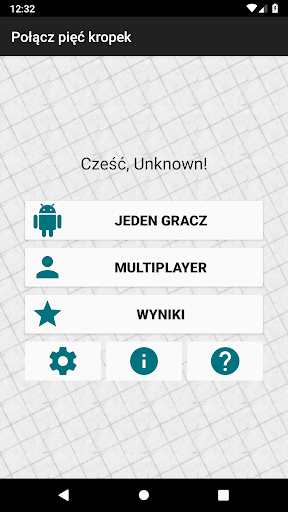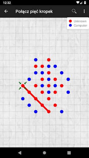 Bądź pierwszy połączywszy pięć kropek w linię prostą: poziomo, pionowo lub ukośnie. Android gra niebieskimi kropkami, grasz czerwonymi kropkami. Czerwone i niebieskie kropki rozmieszczają się po kolei na skrzyżwaniach lini. Pierwszy ruch należy do Ciebie.