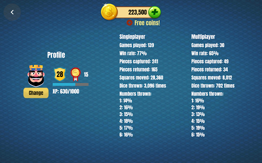 Zagraj w klasyczną grę Chińczyk Ludo Pachisi 2019 z rodziną, dziećmi, przyjaciółmi lub po prostu z ludźmi na całym świecie i bądź gwiazdą. Zacznij grać już teraz i wspinaj się po drabinie, by zostać king Ludo Pachisi 2019! Możesz zobaczyć swoje postępy w Tabeli Liderów, aby porównać, jak dobrze radzisz sobie z innymi graczami.