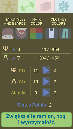 - Wraz z nowym poziomem mięśnie nieznacznie rosną, a w menu postaci otrzymasz punkty statusu zwiększające siłę ramion, nóg i wytrzymałość.