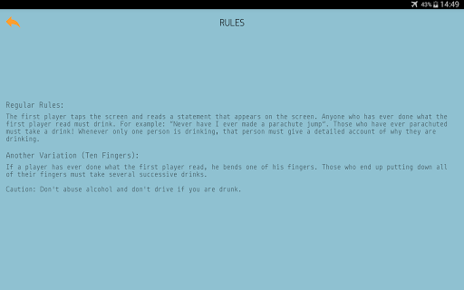 Everything is very simple! Gather your friends, do not forget to buy enough alcohol! Just touch the screen and read the statement. After that, everyone who did the thing from the statement “I have never” drink from their glasses. If players have not drunk enough to share their secrets, just reduce the level of questions openness. You can also play without alcohol - for desire